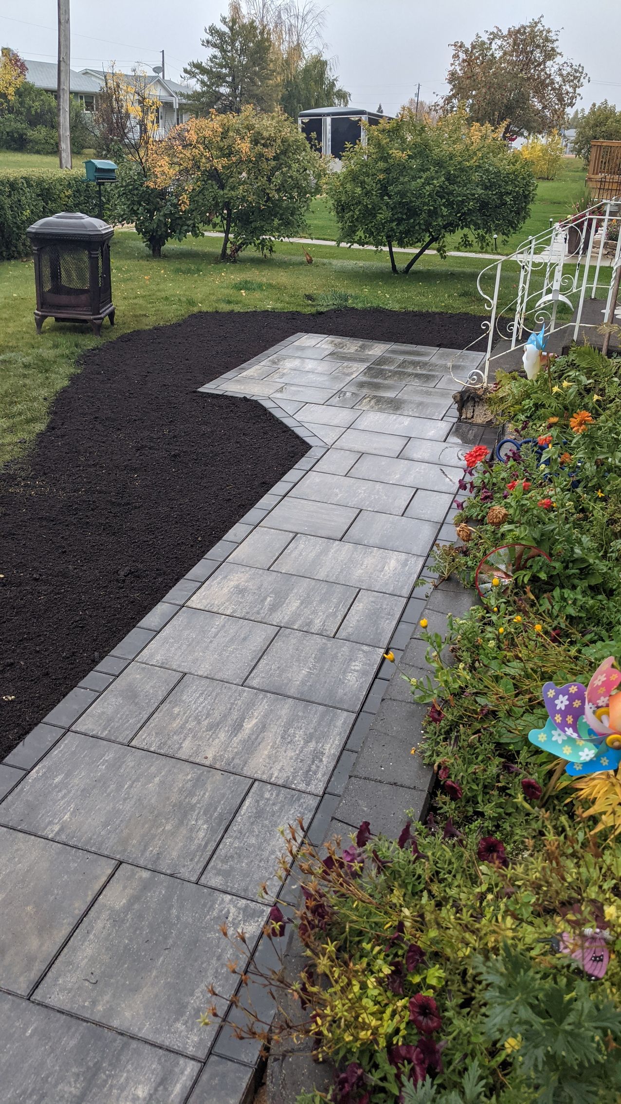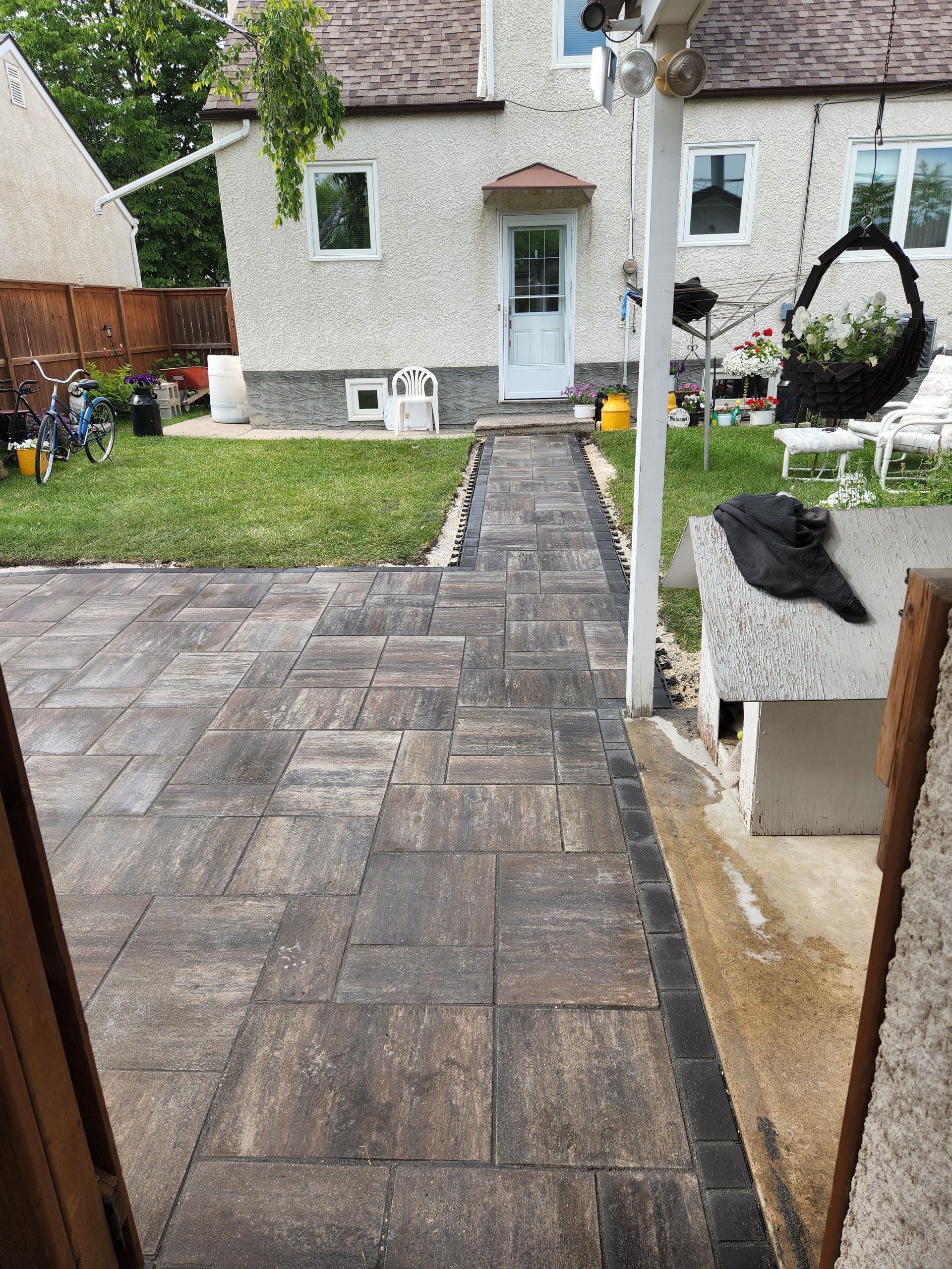 A newly constructed stone paver walkway with black edging, bordered by grass and sand, with a fire hydrant.