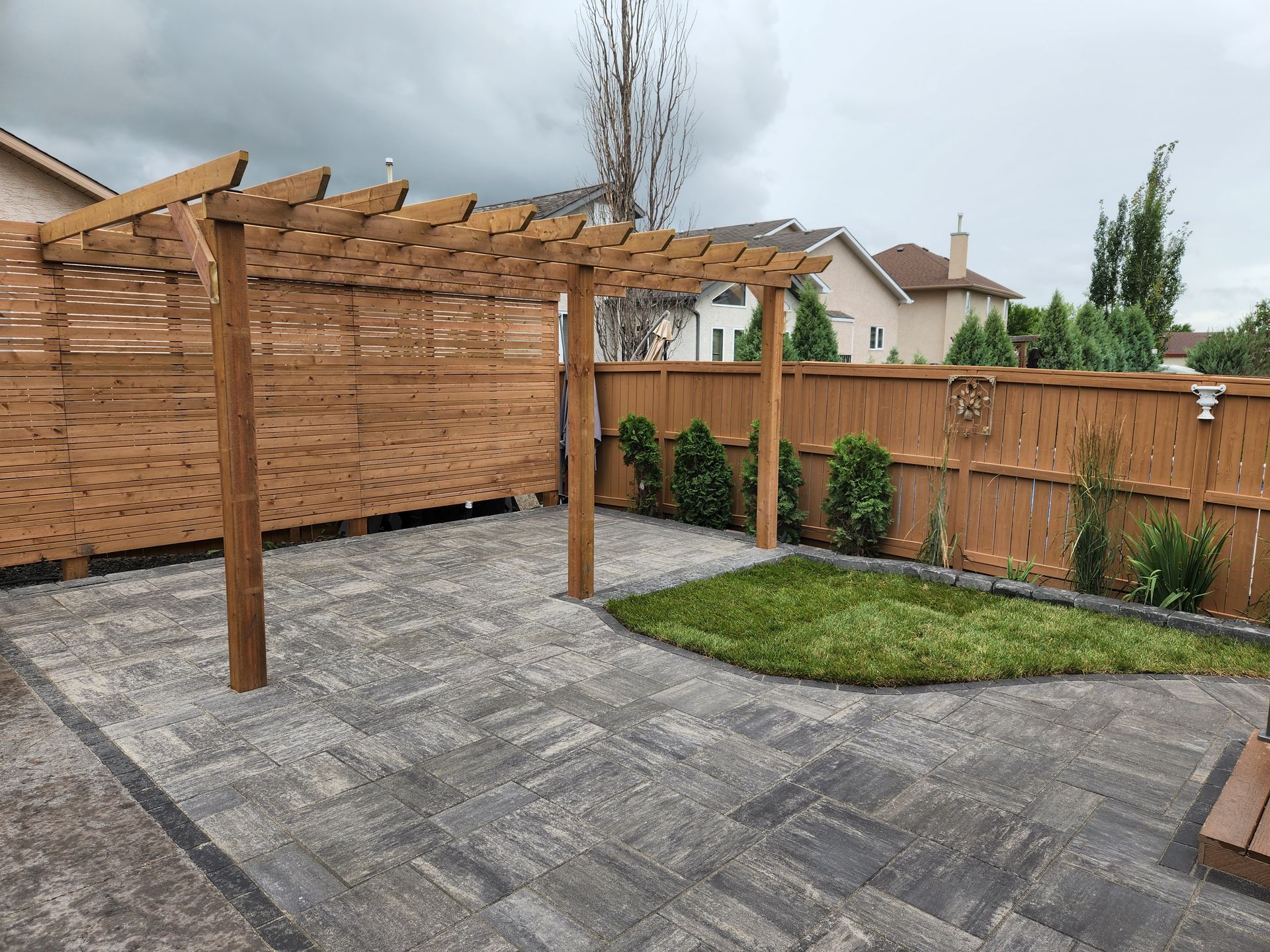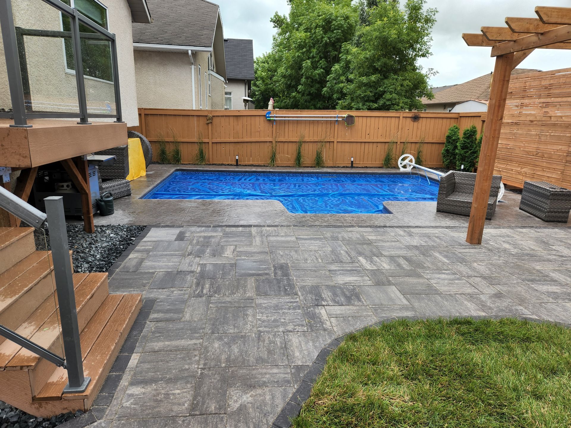 Patio with wicker furniture, umbrella, and a wooden fence. Green grass surrounds paved area.