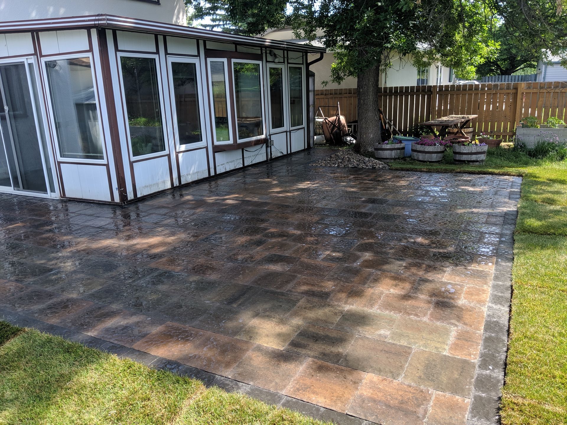 Backyard with brick patio, new grass, wooden fence, and house with back door.