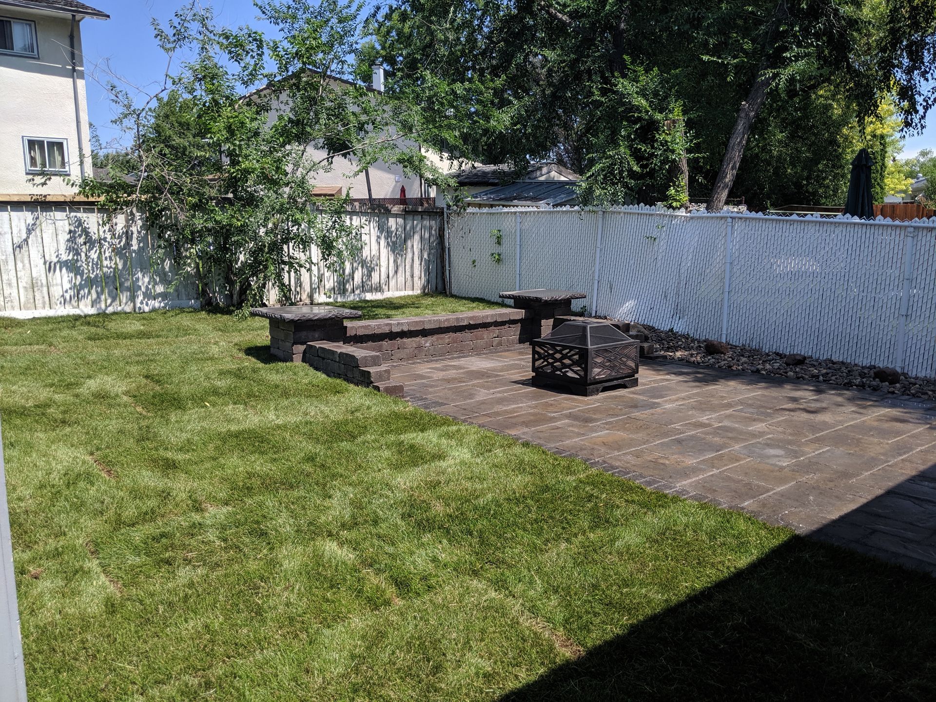 Backyard patio with fire pit, stone seating, and newly laid sod in a residential area.